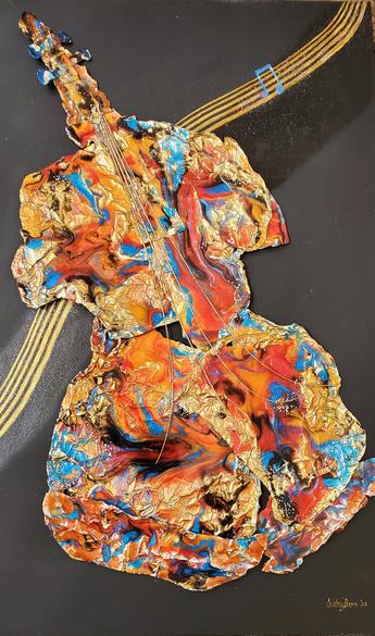 This sculpture was created in resin and is mounted on a 3/4" deep gallery wrapped canvas. The Purchase price includes an antique gold floater frame.