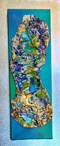 These paintings were created with color- infused resin. The resin is applied to metal and adhered to an oil/acrylic painted canvas. The canvas is mounted on a sheet metal backing.