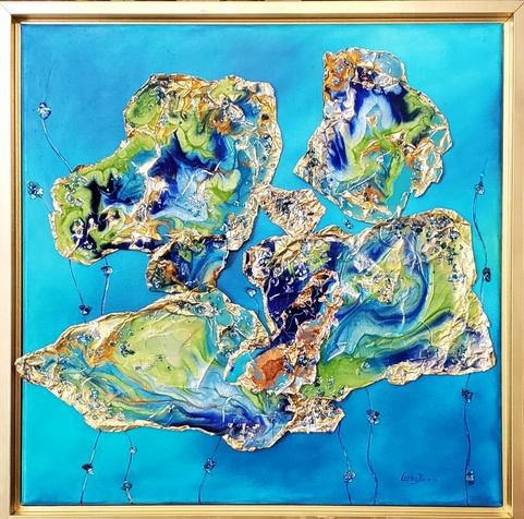 This painting was created with color- infused resin. The resin is applied to metal and adhered to an oil/acrylic painted canvas. This painting is framed with a gold floater frame.